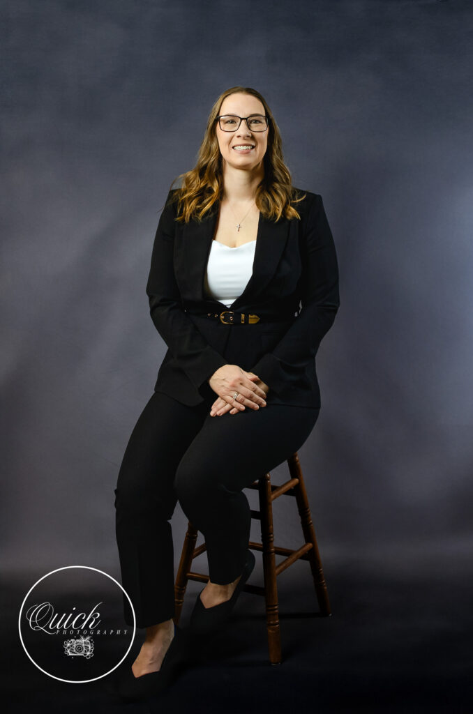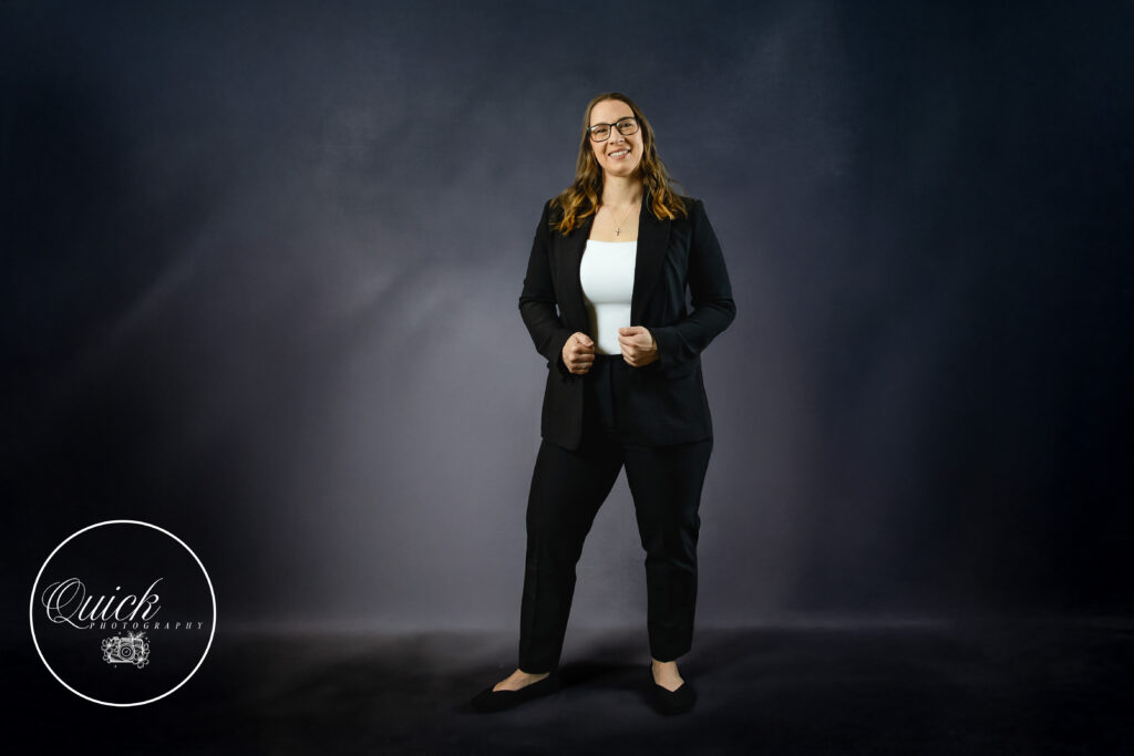 Her choice of wardrobe played a big role. A tailored black blazer paired with a simple white top created a clean, polished look that feels timeless. The neutral tones keep the focus on her expression – warm, confident, and inviting. Her natural smile brings everything together giving potential clients a sense of ease before they even met her.